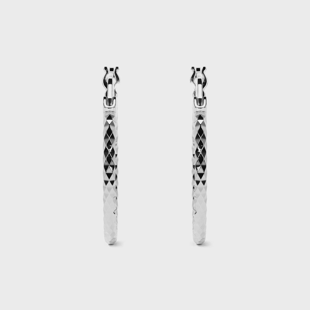 Arracadas de plata 925 con diseño diamantado Panal que captura la luz brillantemente. Ligeras 1.3-3.3g, con medidas de 12-30 Mm de diámetro y tubo de 2mm, combinan elegancia y comodidad para uso diario. Ideales para la mujer que busca un toque refinado en su estilo.